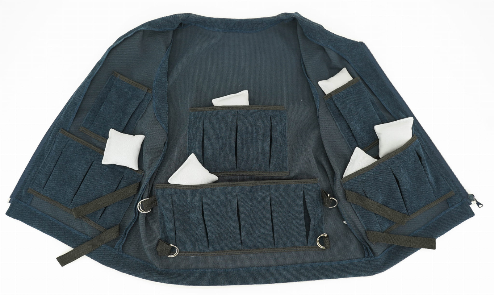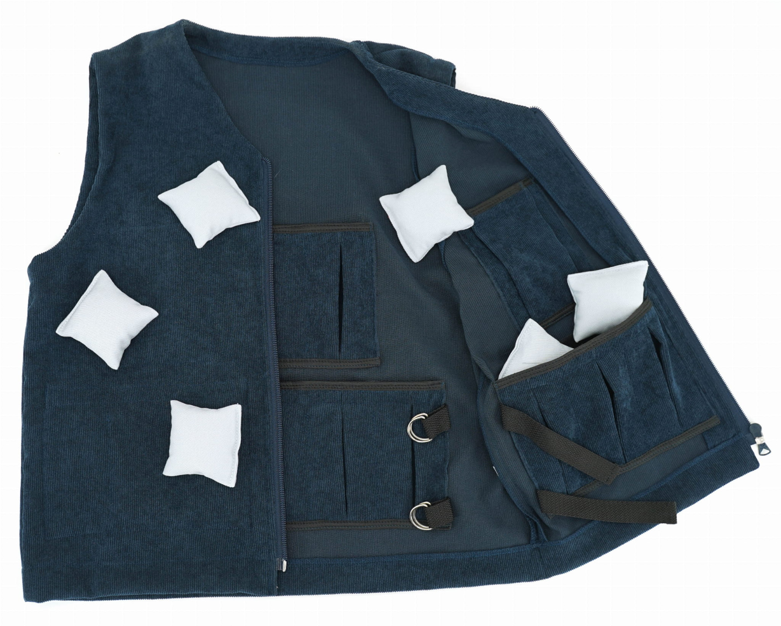Vo vnútri vesty sa nachádzajú vrecká, v ktorých sú rovnomerne rozmiestnené vrecúška so záťažou – vpredu aj vzadu.