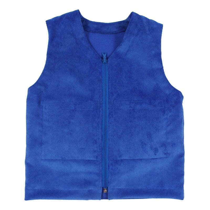 Záťažová vesta na celodenné nosenie je určená na stimuláciu hlbokého vnímania, upokojenie, uvoľnenie a zlepšenie sústredenia počas aktivít v materskej škole alebo v škole. Môže sa nosiť počas hry, ale aj ako bežná súčasť oblečenia počas dňa. Pri jej výrobe kladieme mimoriadny dôraz na estetiku spracovania a funkčnosť. Vestu šijeme z menčestru, ktorý si aj po mnohých praniach zachováva svoju štruktúru.
